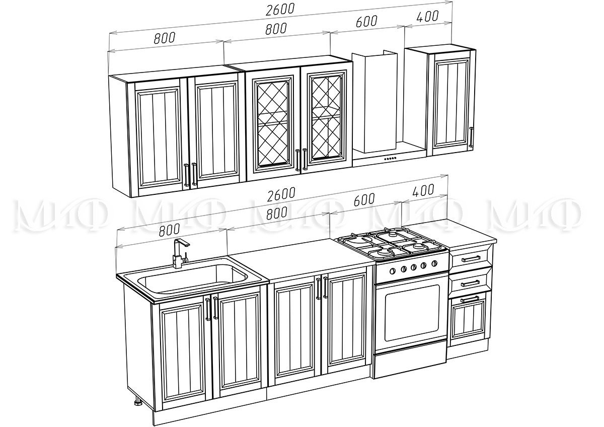 • Глубина шкафов: Верхние 300 мм/Нижние 600 мм/Глубина столешницы 600 мм